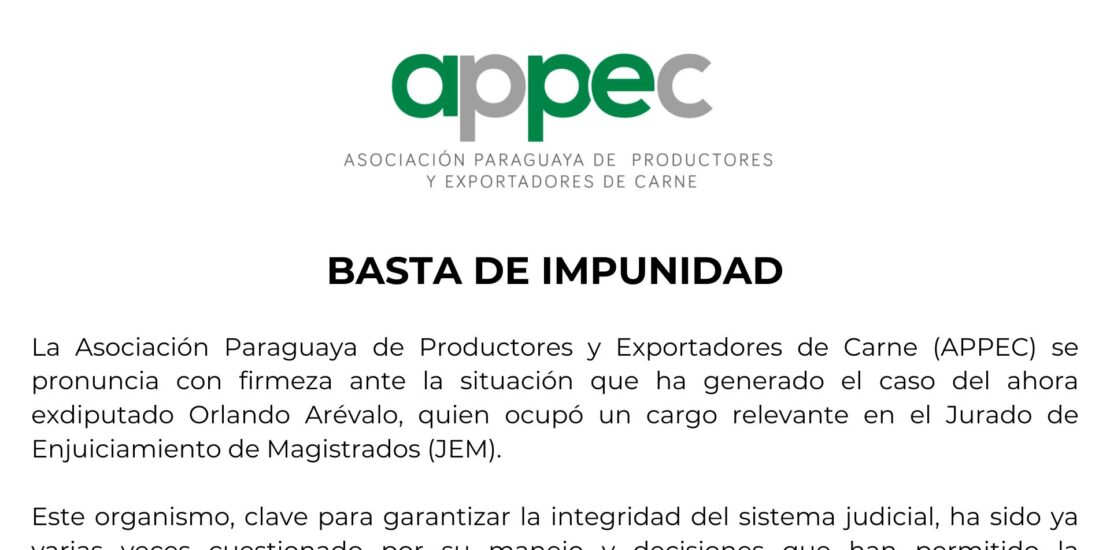 La Asociación Paraguaya de Productores y Exportadores de Carne (APPEC) se pronuncia con firmeza ante la situación que ha generado el caso del ahora exdiputado Orlando Arévalo, quien ocupó un cargo relevante en el Jurado de Enjuiciamiento de Magistrados (JEM).