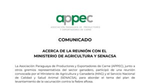 Sobre el debate regional en torno a la fiebre aftosa sin vacunación, la APPEC informó que el Servicio Agrícola y Ganadero (SAG) de Chile expresó que es una decisión soberana de cada país. “Nos alienta a avanzar, pero sin presiones. Paraguay debe hacerlo cuando esté preparado”, concluyó el directivo de la APPEC.